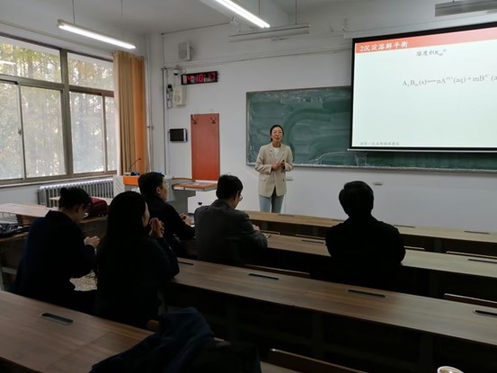 宁静老师对《无机化学》课程中的“溶度积规则”进行创新课程设计,由案例教学引出难溶电解质的溶度积规则的应用,与学生互动良好;孙兰菊老师对《普通化学》课程中“吉布斯自由能和化学反应方向”知识点进行详细讲解,列举例题让学生充分理解、注重知识应用;李怡萌老师对《半导体材料》课程的杂质半导体和本征半导体知识做讲解,图文并茂有助于学生理解。